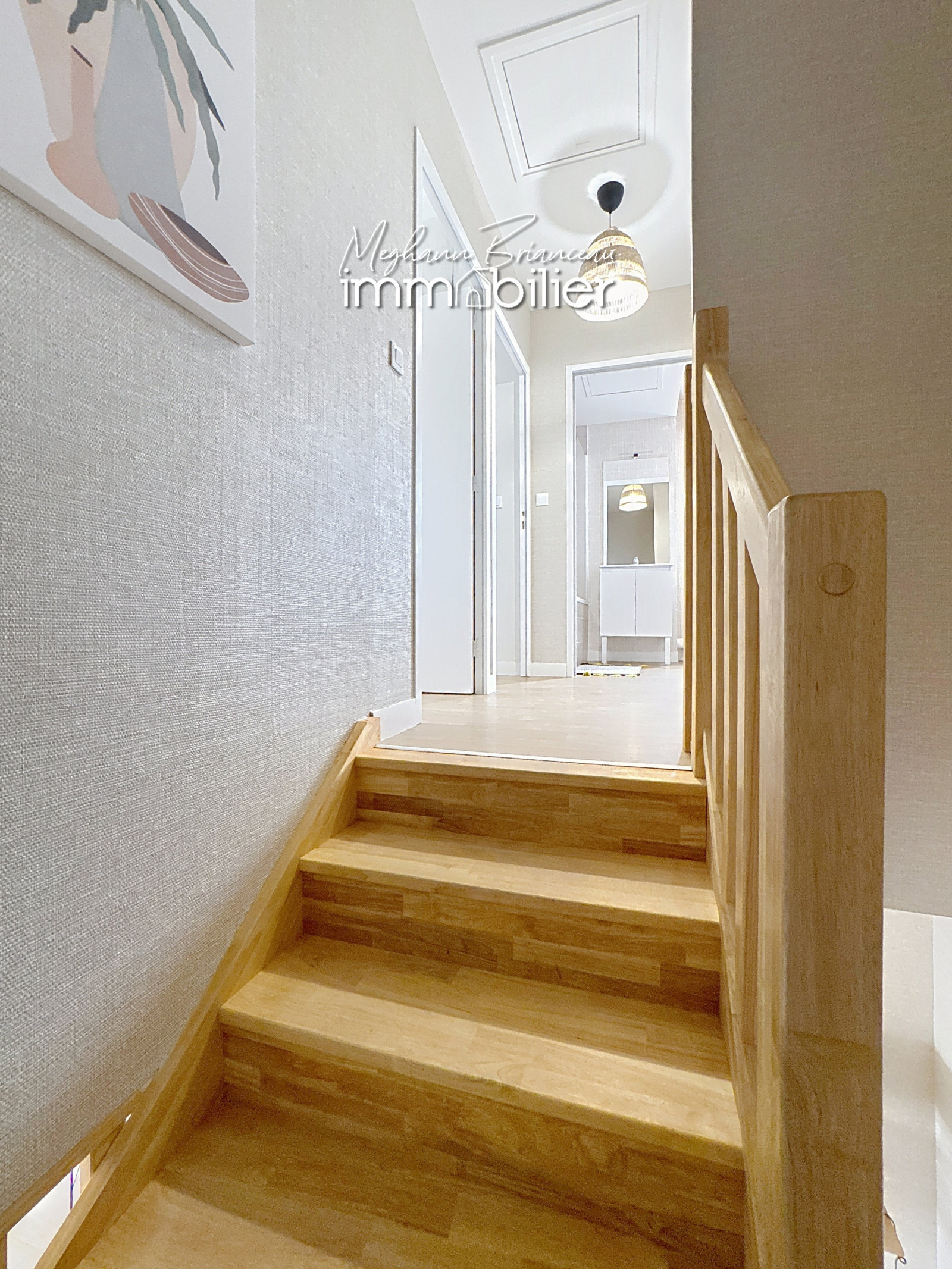 - Au rez-de-chaussée : entrée, séjour lumineux avec cuisine aménagée et équipée, salle d’eau avec WC